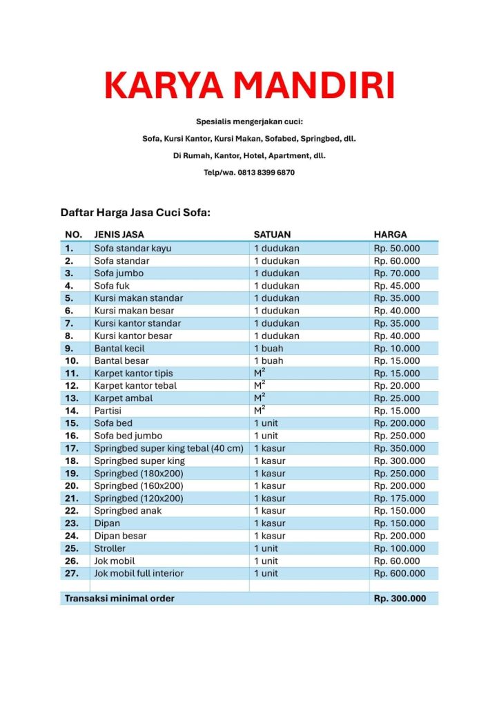 Cuci kursi kantor Cuci kursi makan Cuci karpet rumah Cuci karpet kantor Cuci karpet mesjid Cuci sofa Cuci sofa bed Cuci springbed Cuci matras Cuci dipan Cuci headboard Cuci stoiler Cuci jok mobil